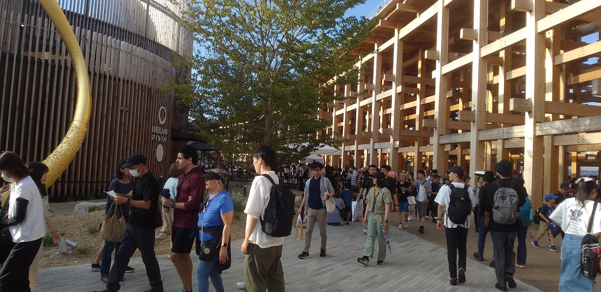 今日が最後の大阪万博アイルランドの旅となる(入場券が取れない)。12時過ぎ、夢洲駅から東ゲート会場に向かった。2時過ぎ前回よりスムーズに入門できた。真夏の暑さの中かなりの混雑。各パビリオンの待ち時間1〜2時間以上。「大屋根リング・外ポツプアプステージ」前から大屋根リングをくぐると右手にりアイルランドパビリオンがある。今日のアイルランドパビリオン前はそれほど混雑していない。若いスタッフが4人、予約完了者達をロープで仕切られた「通路」中に並ぶよう指示している。すでに30人ぐらい。以前は予約なし1時間〜2時間待ちで入館できた。その時は100人越えの長蛇の列
